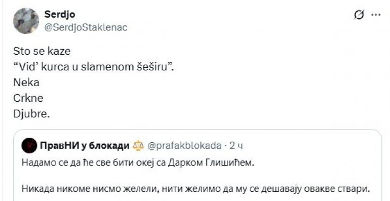 SRĐAN Dragojević, blokader, pokazao je koliki je bolesnik kada je u objavama na društvenoj mreži Iks poželeo da ministar Darko Glišić koji je doživeo moždani udar umre.