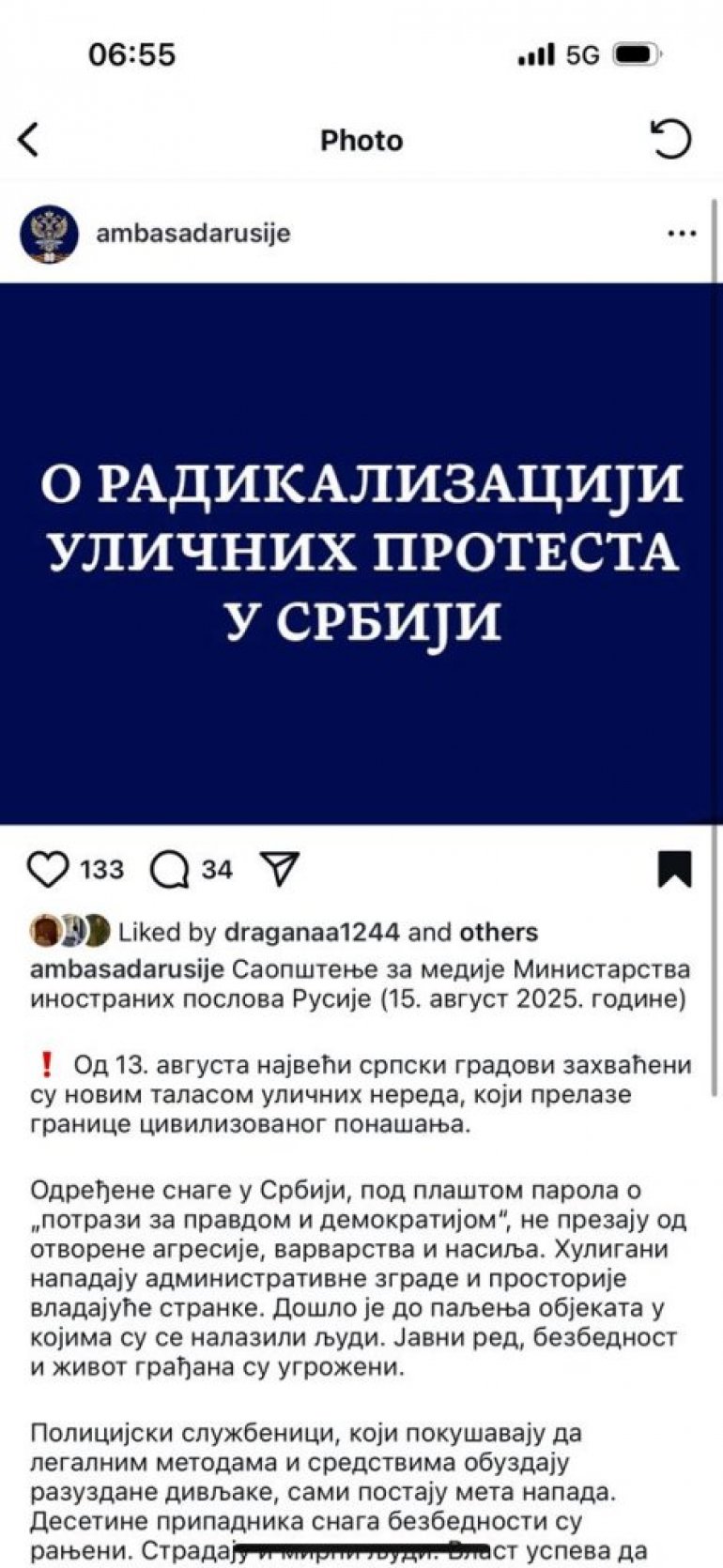 Naime, u zvaničnog saopštenju Ruskog ministarstva spoljnih poslova navodi se da protesti u Srbiji prelaze sa mirnih demonstracija na nasilni scenario, uprkos činjenici da rukovodstvo zemlje predlaže mere za rešavanje neslaganja u političkoj, pravnoj i ustavnoj oblasti.