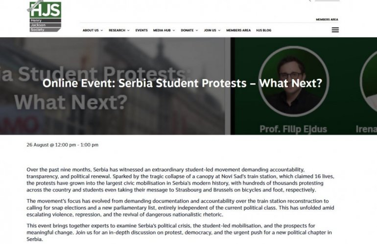 - Ovaj događaj okuplja stručnjake kako bi se analizirala politička kriza u Srbiji, studentska mobilizacija i izgledi za značajne promene. Učesnici će razgovarati o protestima, demokratiji i hitnoj potrebi za novim političkim poglavljem u Srbiji - navodi se u pozivu britanske NVO.