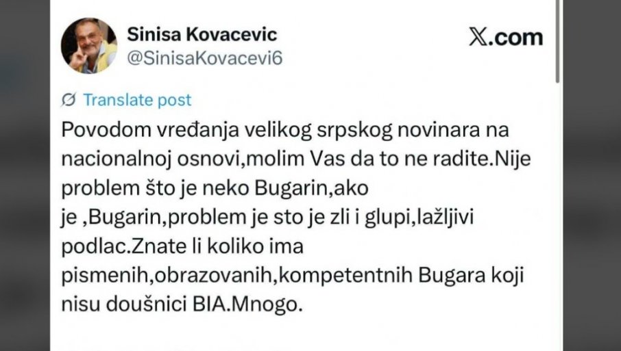 -Povodom vređanja velikog srpskog novinara na nacionalnoj osnovi, molim Vas da to ne radite. Nije problem što je neko Bugarin, ako je Bugarin, problem je što je zli i glupi, lažljivi podlac. Znate li koliko ima pismenih, obrazovanih, kompetentnih Bugara koji nisu doušnici BIA? Mnogo- napisao je Kovačević.