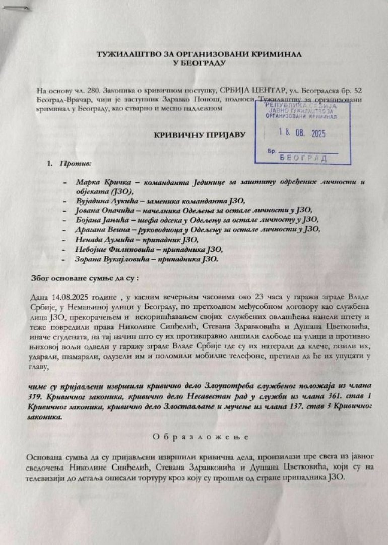 Kao i činjenica da je u momentu iznošenja optužbi, dakle 15. avgusta, stigla da gostuje na televiziji, ali ne i da uradi lekarski pregled i izvadi povredne liste, koje je najavila da će izvaditi 18. avgusta, na dan kada je Zdravko Ponoš, lider prozapadne opozciione stranke u njeno ime podneo krivičnu prijavu.