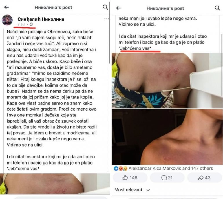 Naime, optužbe koje je Nikolina Sinđelić iznela 15. avgusta tvrdeći da joj je načelnik Kričak udarao glavom o zid i navodio kako će je silovati dok svi gledaju, nije nešto što Sinđelić pokušava da nametne kao istinu prvi put. Tačno mesec i po dana ranije, 3. jula, Nikolina je na Fejsbuku objavila vrlo sličnu priču. Optužila je policiju da je tukla, navela kako joj je inspektor oteo telefon, bacio ga i rekao: „Je*aćemo vas.“