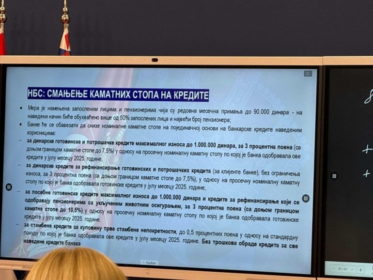 - Promenili smo tu odluku. Za zaposlene do 100.000 dinara, njih je 64,3% u državi. I za penzionere povećavamo do 100.000. To je 92% odsto penzionera. Moji roditelji imaju veće penzije, na njih se ovo neće odnositi. Ostali smo dužni penzionerima. Daćemo sve od sebe da se odnosi na sve penzinere. Pregovaramo. Tu se radi o gotovinskim, potrošačkim i stambenim kreditima.