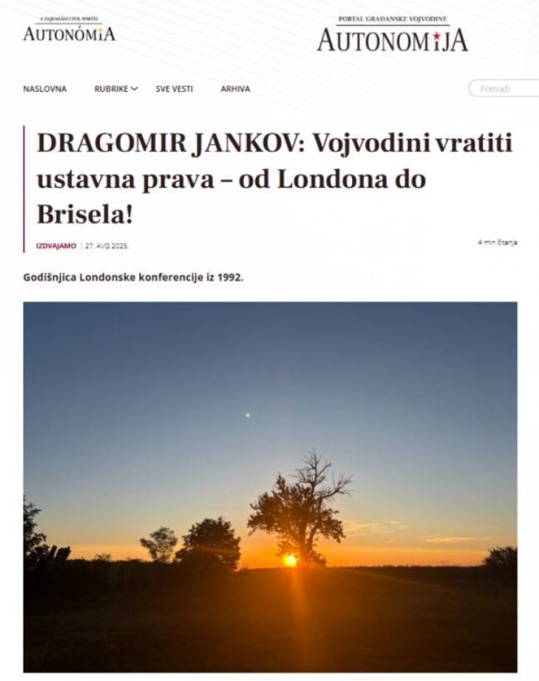 Na Gruhonjićevom portalu Autonomija objavljen je članak u kom se traži da se Vojvodini vrate "ustavna prava", da Vojvodina mora biti međunarodno priznata, da pitanje Vojvodine više ne može biti isključivo unutrašnje i nedodirljivo pitanje Srbije!