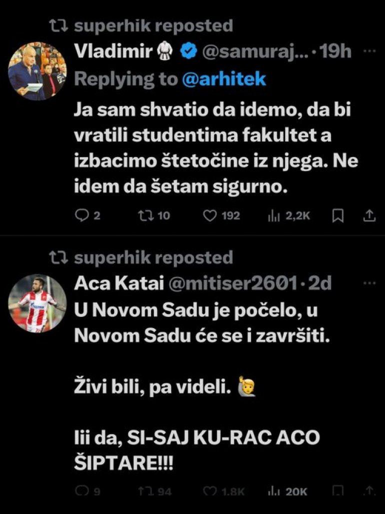 - U Novom Sadu je počelo, u Novom Sadu će se i završili. Živi bili, pa videli. Iii da, S*-**J K*-*** ACO ŠIPTARE!!! - piše korisnik mreže Iks.