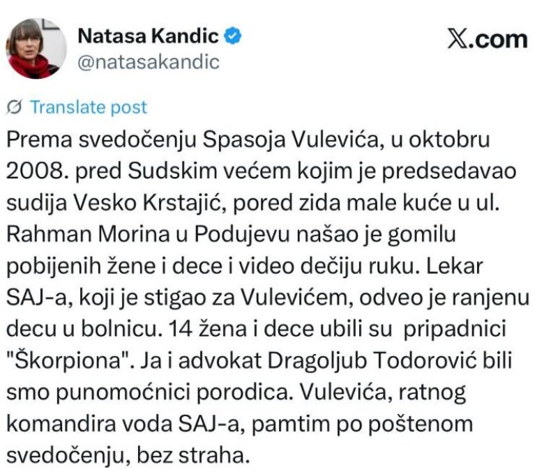 - Prema svedočenju Spasoja Vulevića, u oktobru 2008. pred Sudskim većem kojim je predsedavao sudija Vesko Krstajić, pored zida male kuće u ul. Rahman Morina u Podujevu našao je gomilu pobijenih žene i dece i video dečiju ruku. Lekar SAJ-a, koji je stigao za Vulevićem, odveo je ranjenu decu u bolnicu. 14 žena i dece ubili su pripadnici "Škorpiona". Ja i advokat Dragoljub Todorović bili smo punomoćnici porodica. Vulevića, ratnog komandira voda SAJ-a, pamtim po poštenom svedočenju, bez straha. - napisala je Nataša Kandić.