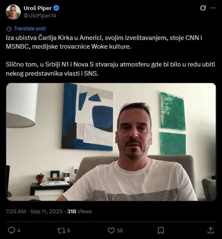 PIPER O UBISTVU ČARLI KIRKA: "Ono što rade medijske trovačnice N1 i Nova S, može da dovede do iste nesreće u Srbiji"
