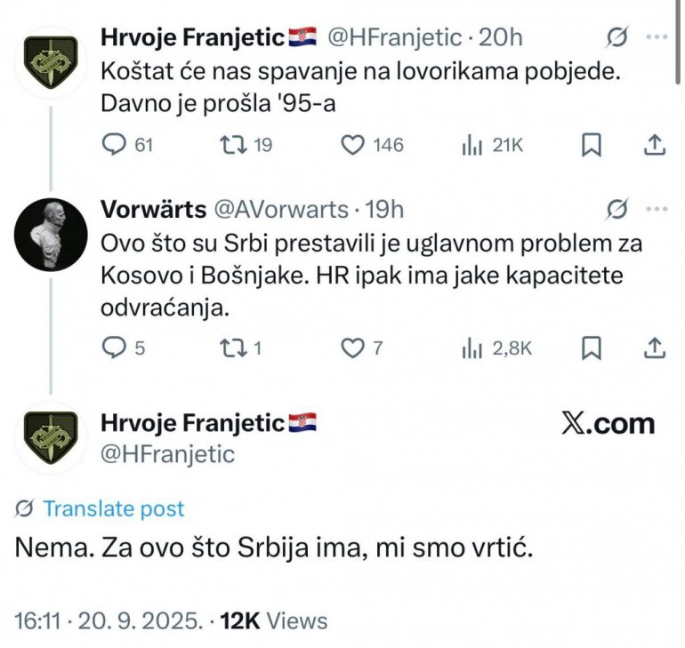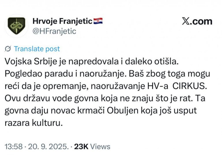 - Vojska Srbije je napredovala i daleko otišla. Pogledao paradu i naoružanje. Baš zbog toga mogu reći da je opremanje, naoružavanje HV-a CIRKUS. Ovu državu vode govna koja ne znaju što je rat. Ta govna daju novac krmači Obuljen koja još usput razara kulturu - napisao je on, pa dodao: