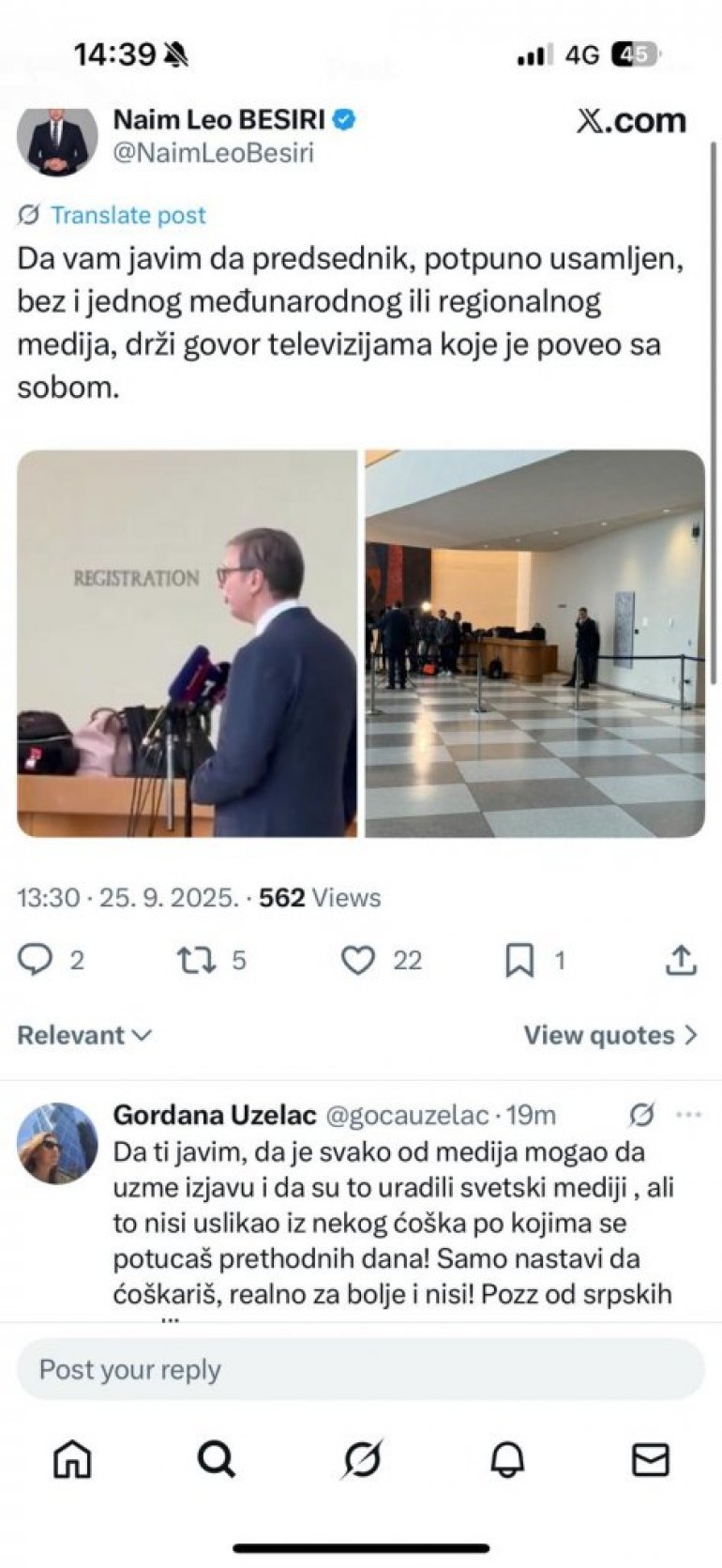 Beširi je objavio fotografiju predsednika Vučića iz Njujorka, gde je šef srpske države davao izjave za domaće medije, i uz to dodao sarkastičan komentar:
