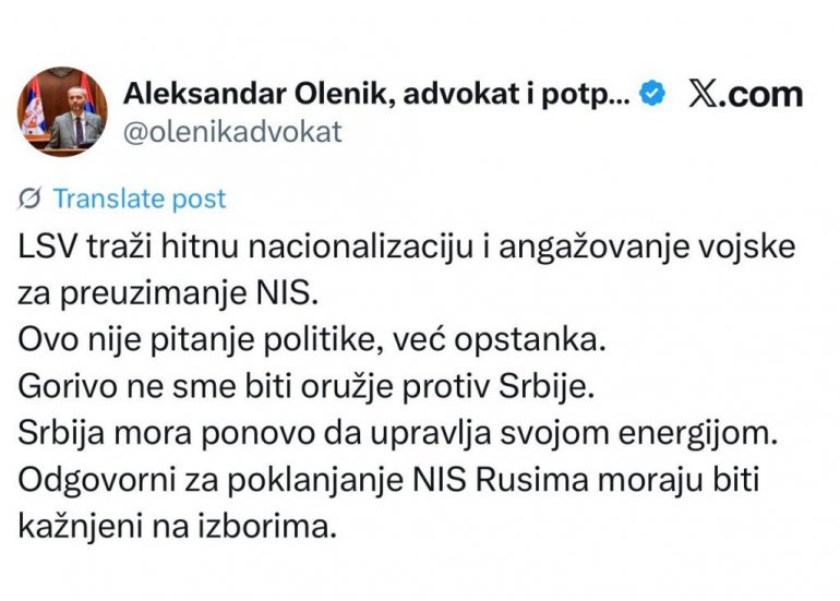 - LSV traži hitnu nacionalizaciju i angažovanje vojske za preuzimanje NIS. Ovo nije pitanje politike, već opstanka. Gorivo ne sme biti oružje protiv Srbije. Srbija mora ponovo da upravlja svojom energijom. Odgovorni za poklanjanje NIS Rusima moraju biti kažnjeni na izborima - stoji u objavi Olenika.