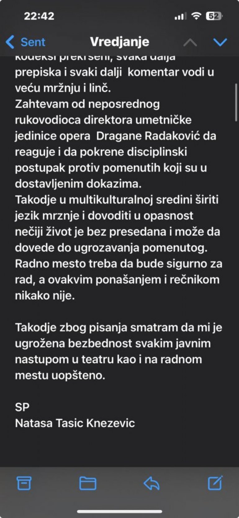 Nataše Tasić obratila se rukovodstvu Srpskog narodnog pozorišta nakon onoga što je preživela.