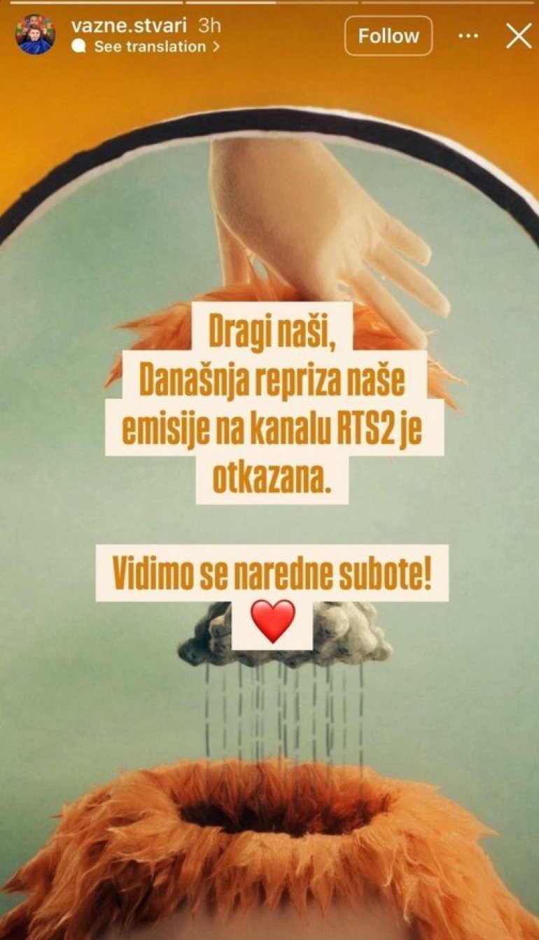 - Dragi naši, današnja repriza naše emisije na kanalu RTS2 je otkazana. Vidimo se naredne subote - piše u postu.