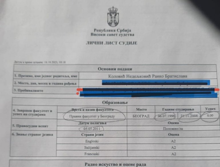 NAKON skandaloznog saznanja da kandidatkinja za člana Visokog saveta sudstva, jednog od najviših pravnih institucija u državi, Bratislava Kolović Nedeljković, sudija Prvog osnovnog suda u Beogradu, od obrazovanja ima privatni pravni fakultet koji u vreme njenog diplomiranja nije čak ni imao akreditaciju, usledio je neverovatan nastavak.