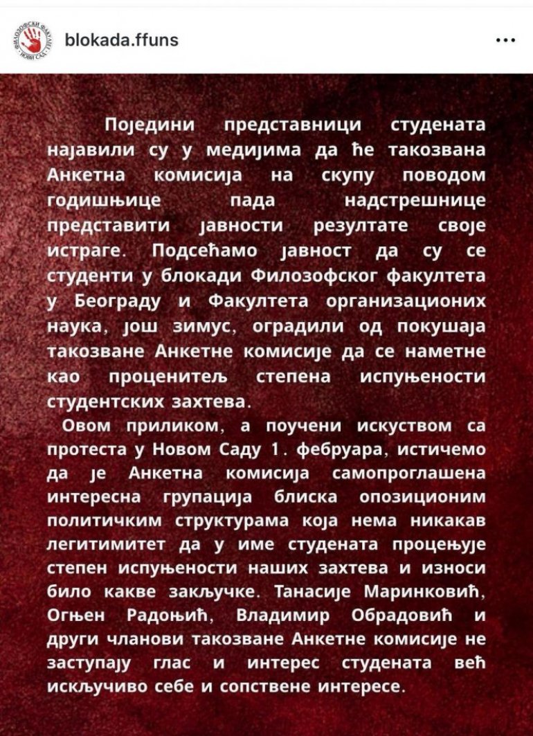 Tako su sinoć blokaderi plenumaši sa Filozofskog fakukteta u Novom Sadu, takozvana Dinkova ekipa, žestoko udarili na lažnu anketnu komisiju koju predvode Đilasovci Vladimir Obradović i Ognjen Radonjić i porucili im da nisu dobrodosli u Novom Sadu.
