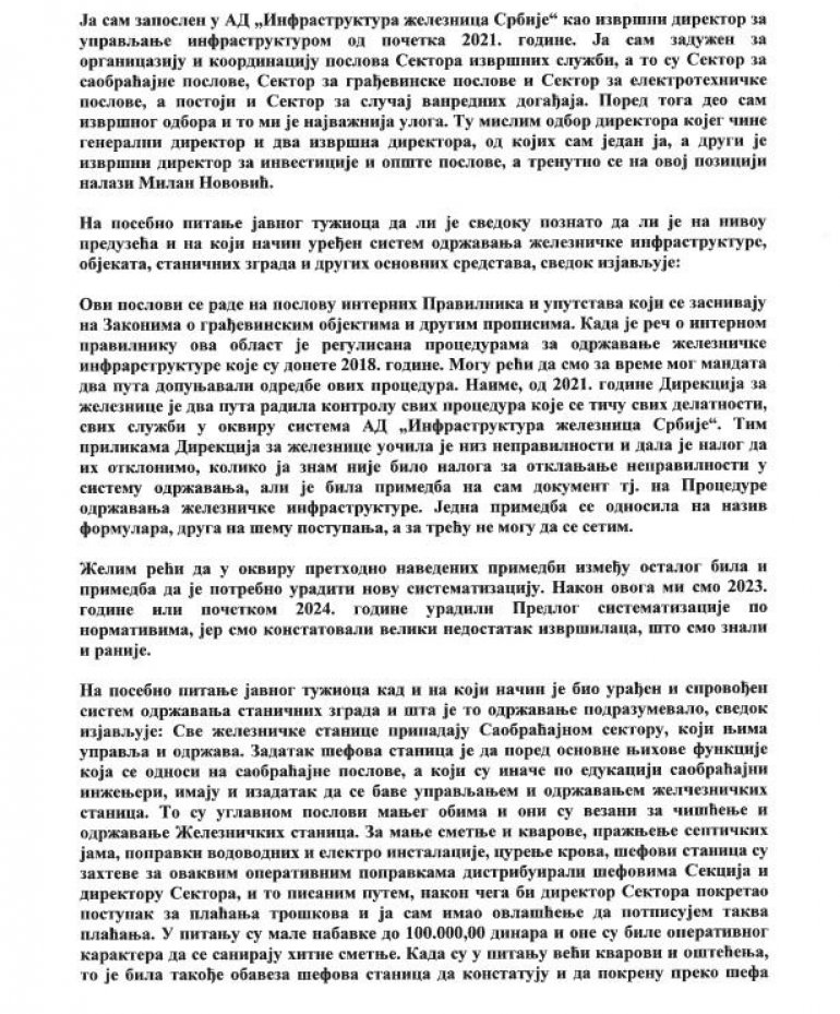 BIVŠI izvršni direktor kompanije Infrastruktura Železnice Srbije i drug sa slike tužioca za organizovani kriminal Mladena Nenadića Milutin Milošević u izjavi koju je dao 6. decembra prošle godine u Višem javnom tužilaštvu u Novom Sadu priznao je da je bio lično zadužen za održavanje nadstrešnice kao i da ona nije održavana.