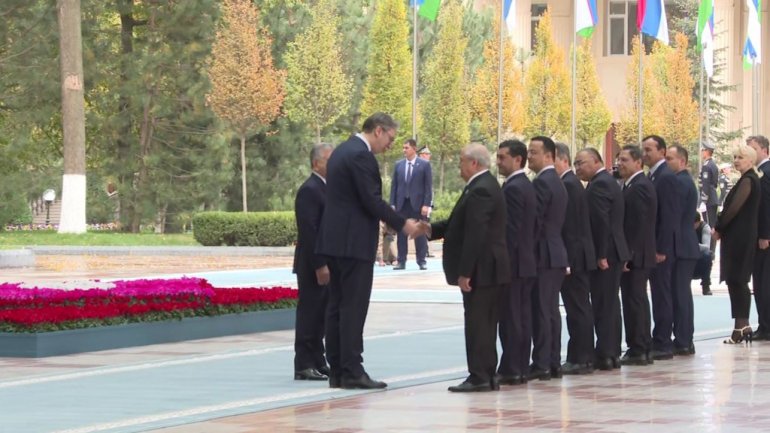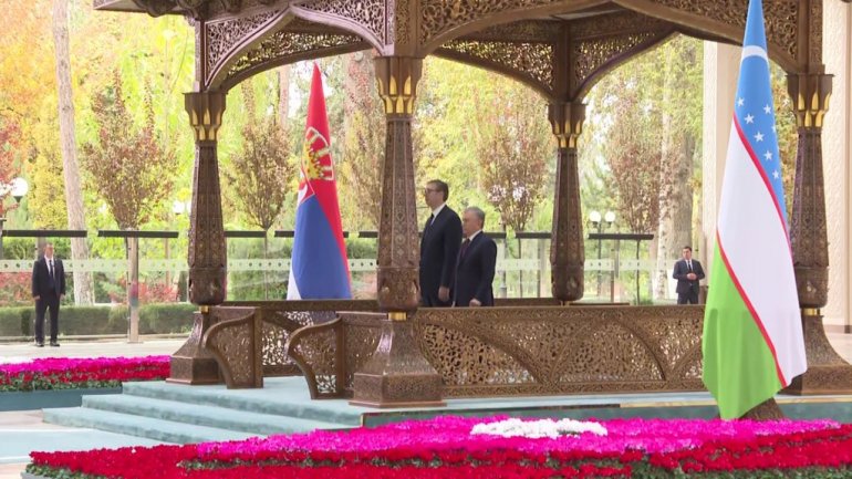 Predsednik Uzbekistana Šavkat Mirzijojev dočekao je danas predsednika Srbije Aleksandra Vučića u državnoj rezidenciji "Kuksaroj", uz svečani doček, vojne počasti, smotru počasnog stroja i intoniranje himni dve zemlje.