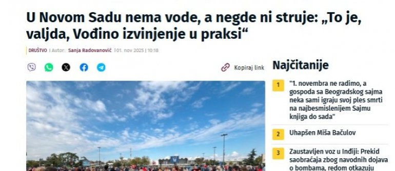 Nova je objavila da je nestala i struja i voda u Novom Sadu naglasivši da je to "Vođino izvinjenje u praksi", i ako je JKP Vodovod i kanalizacija rekla da je došlo do nestanka struje na Fabrici vode i da je alternativno napajanje odmah obezbeđeno.