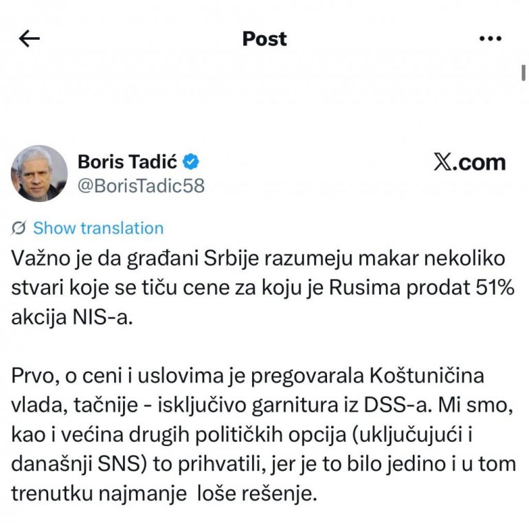 - Važno je da građani Srbije razumeju makar nekoliko stvari koje se tiču cene za koju je Rusima prodat 51% akcija NIS-a.