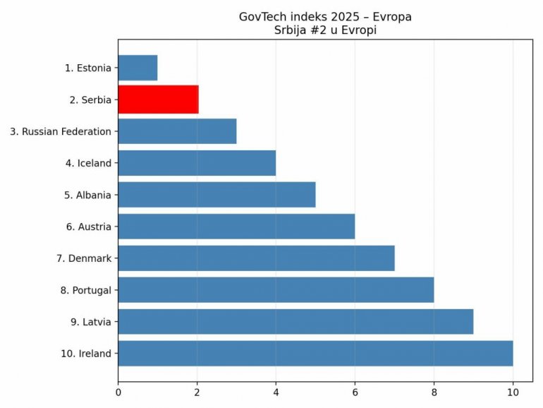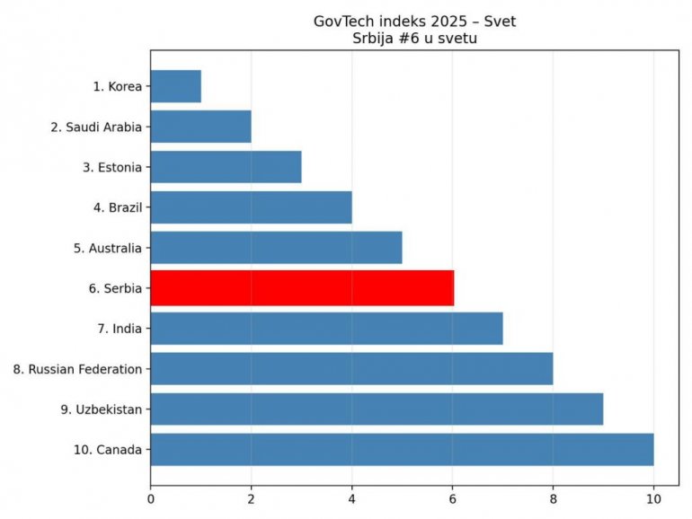 Izašao novi GovTech Maturity Index - indeks tehnološke zrelosti javne uprave (GovTech Maturity Index – GTMI) koji se od 2020. godine objavljuje u istoimenom izveštaju Svetske banke, uz prateći set podataka. U ovogodišnjem izveštaju Srbija je dodatno napredovala i pozicionirana je na drugom mestu u Evropi i 6. u svetu. Ispred Srbije su Koreja, Saudijska Arabija, Estonija, Brazil i Australija! U prethodnom izveštaju 2022. godine, Srbija je prema vrednosti GTMI indeksa bila pozicionirana na 4. mestu u Evropi  i 11. na svetu.