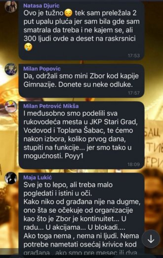 - Sve je to lepo, ali treba pogledati istinu u oči.  Kako niko od građana nije na dugme, ono šta se očekuje od organizacije kao što je Zbor je kontinuitet...U radu.. U akcijama.. U blokadi... Ako toga nema, nema ni ljudi. Nema potrebe nametati osećaj kricice kod građana.. - navodi se u porukama.