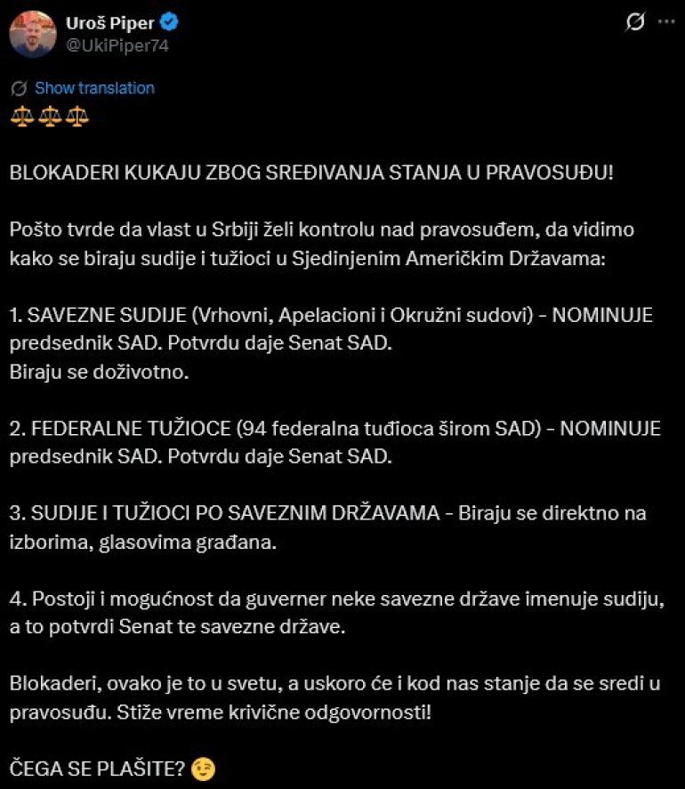 NOVINAR Uroš Piper uporedio je način izbora sudija i tužilaca u Sjedinjenim Američkim Državama i u Srbiji