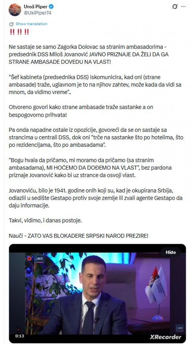 "Ne sastaje se samo Zagorka Dolovac sa stranim ambasadorima - predsednik DSS Miloš Jovanović JAVNO PRIZNAJE DA ŽELI DA GA STRANE AMBASADE DOVEDU NA VLAST!