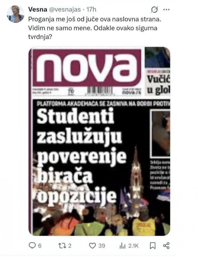Tako je tekst koji je objavila Nova S, pod naslovom "Studenti zaslužuju poverenje birača opozicije", izazvao reakcije na društvenim mrežama.
