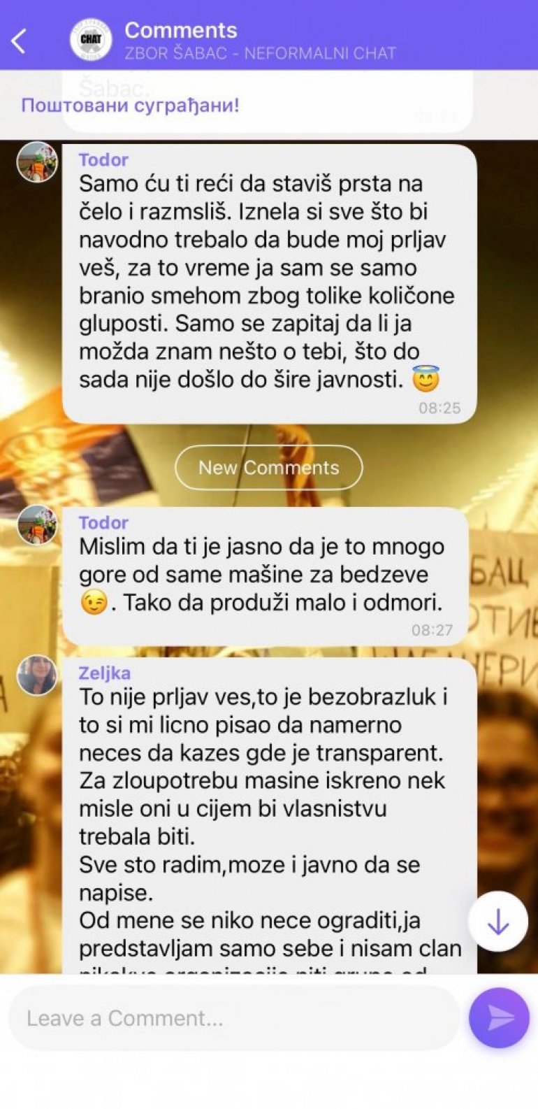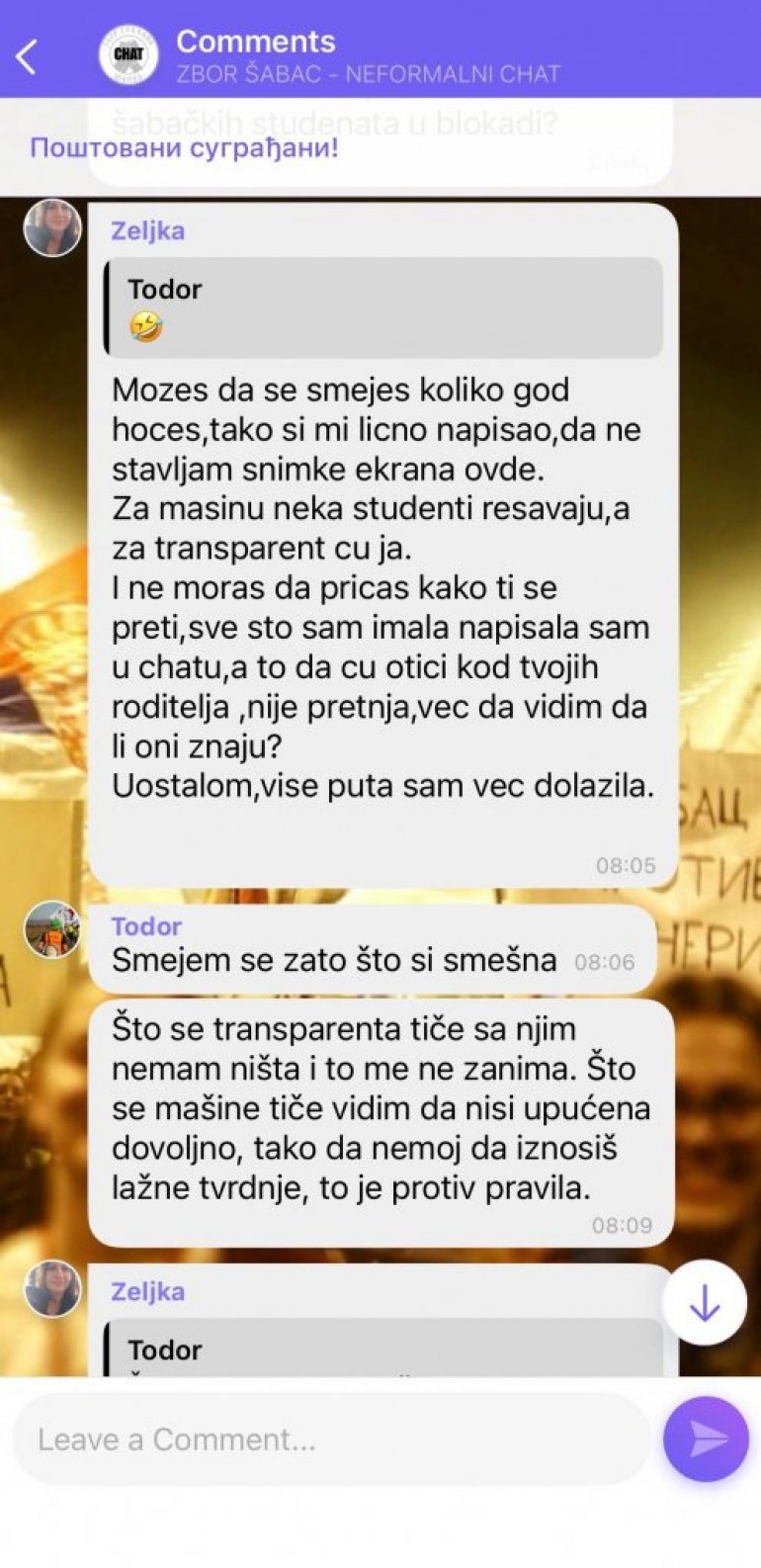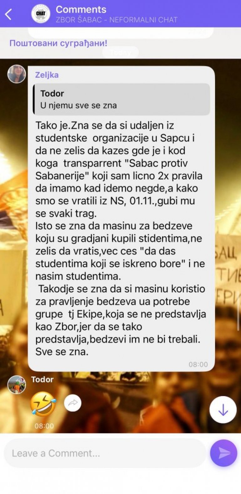 Od ukradenih mašina za izradu bedževa i transparenata, do opomene da je vreme da se "stavi prst na čelo" i najgorih međusobnih uvreda, pogledajte kakve poruke razmenjuju na Vajberu šabački blokaderi:ž