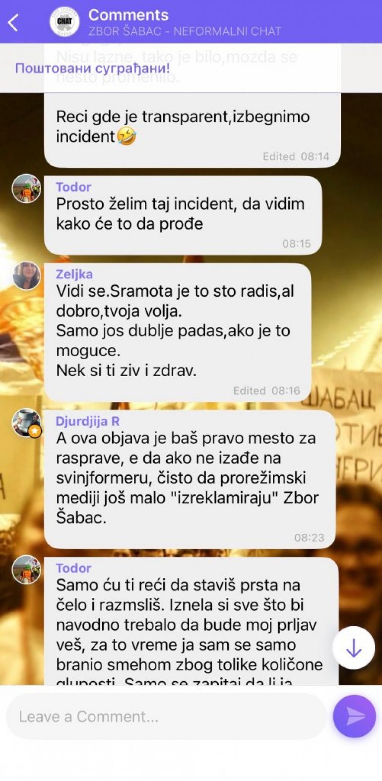 Naime, u njihovoj vajber grupi pod nazivom "Zbog Šabac". napadi i uvrede samo pljušte, a ne zna se ni ko koga ni za šta sve optužuje.