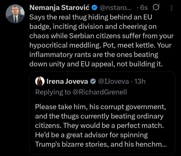 MINISTAR za evropske integracije Nemanja Starović odgovorio je na društvenoj mreži Iks članici Evropskog parlamenta Ireni Jovevoj.