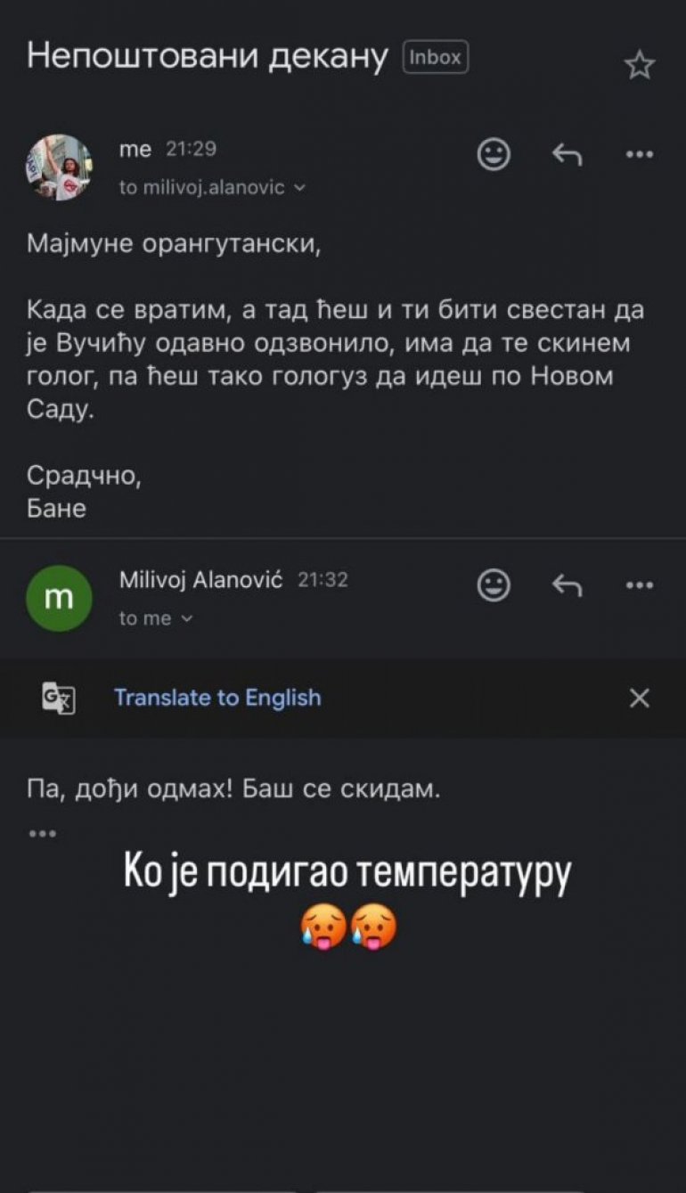 Đorđević je u mejlu drsko i bezobrazno izvređao dekana Filozofskog fakulteta Milivoja Alanovića. Dekan je na pretnju i provokacije odgovorio tačno onako kako treba – duhovito i britko.
