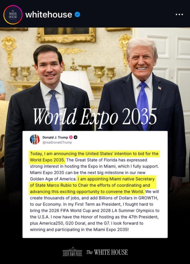 - Danas objavljujem nameru Sjedinjenih Američkih Država da se kandiduju za Svetsku izložbu EKSPO 2035. Velika država Florida izrazila je snažno interesovanje da bude domaćin EKSPO-a u Majamiju, što u potpunosti podržavam. EKSPO Majami 2035 može biti sledeća velika prekretnica u našem novom zlatnom dobu Amerike. Imenujem državnog sekretara, rođenog Majamca, Marka Rubija da predsedava naporima koordinacije i unapređenja ove uzbudljive prilike da okupimo svet. Otvorićemo hiljade radnih mesta i dodati milijarde dolara RASTA našoj ekonomiji. U mom prvom mandatu kao predsednika, žestoko sam se borio da dovedem Svetsko prvenstvo u fudbalu 2026. i Letnje olimpijske igre 2028. u Los Anđelesu u Sjedinjene Američke Države. Sada imam čast da kao 47. predsednik budem domaćin, uz Amerika 250, G20 Doral i G7. Radujem se pobedi i učešću na EKSPO Majami 2035 - napisao je Tramp na društvenoj mreži Truth Social.