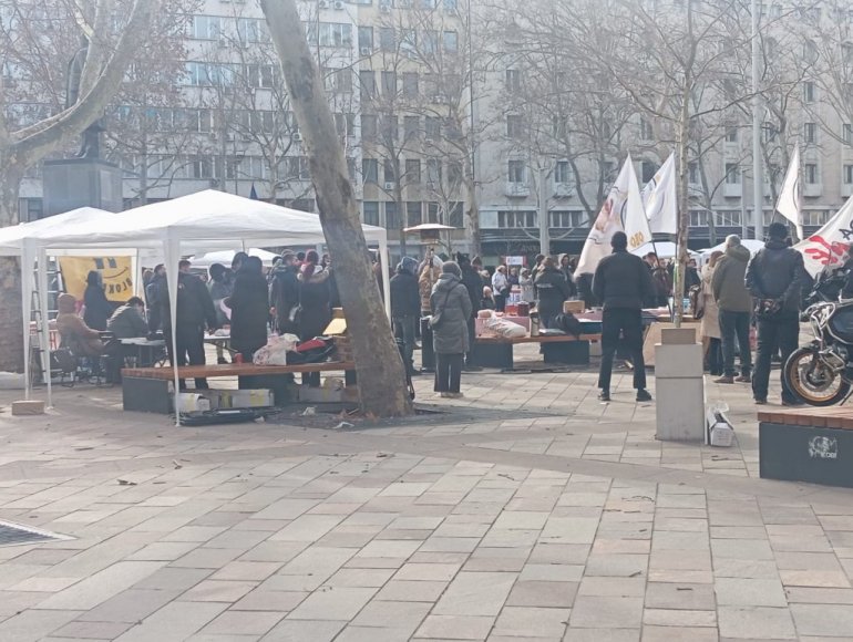 Šatori su raspoređeni u centralnom delu Trga Nikole Pašića, a prisutne su manje grupe blokaderskih učesnika.