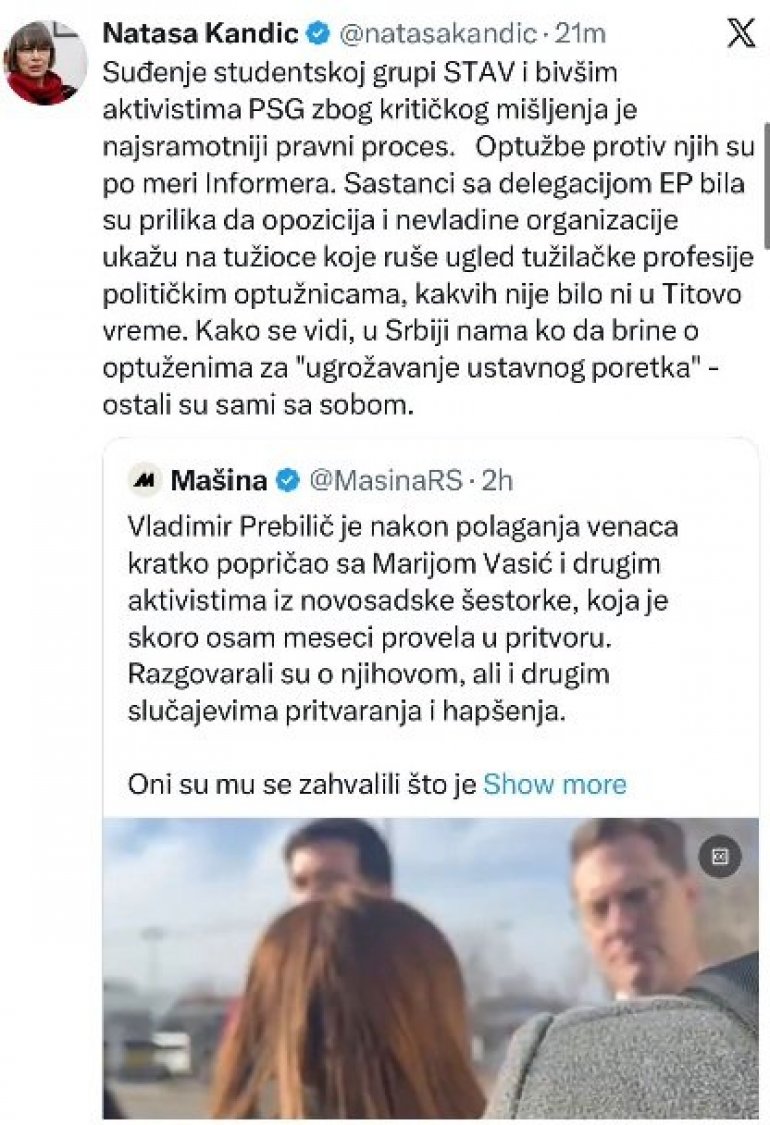 - Suđenje studentskoj grupi STAV i bivšim aktivistima PSG zbog kritičkog mišljenja je najsramotniji pravni proces. Optužbe protiv njih su po meri Informera. Sastanci sa delegacijom EP bila su prilika da opozicija i nevladine organizacije ukažu na tužioce koje ruše ugled tužilačke profesije političkim optužnicama, kakvih nije bilo ni u Titovo vreme. Kako se vidi, u Srbiji nama ko da brine o optuženima za "ugrožavanje ustavnog poretka" - ostali su sami sa sobom - objavila je ona na X-u.