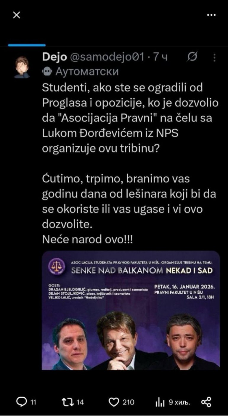 Čak se i jedan od najistaknutijih blokadera koji je poznat po tome što kritikuje pokušaje opozicije da preuzme studentski pokret na mreži X obratio se rečima: „Studenti, ako ste se ogradili od Proglasa i opozicije, ko je dozvolio da Asocijacija Pravni na čelu sa Lukom Đorđevićem iz NPS organizuje ovu tribinu?“.