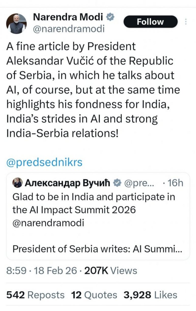 PREDSEDNIK Indije Narendra Modi podelio je tekst predsednika Srbije Aleksandra Vučića na mreži X.