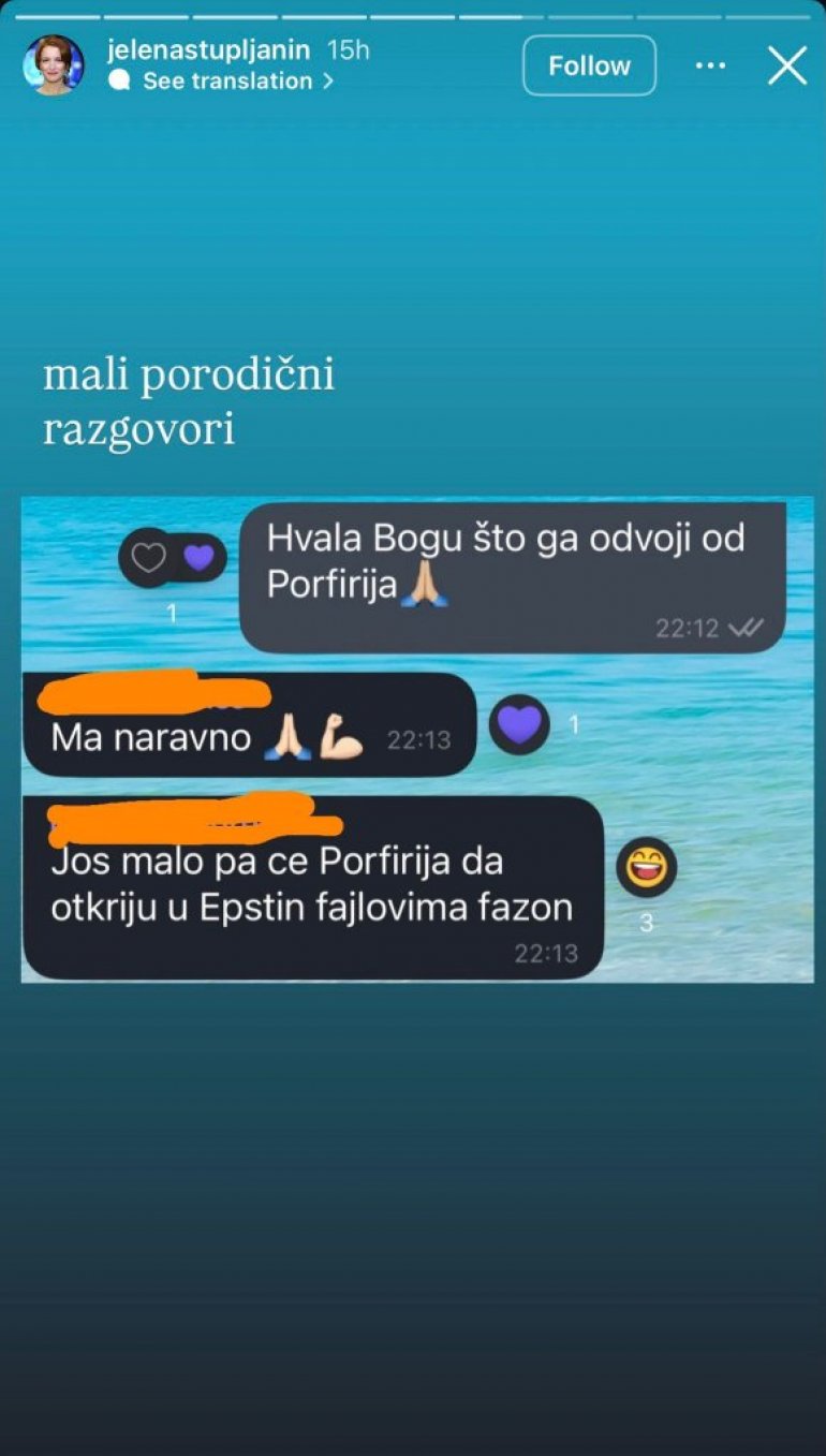 Nižerazredna glumica i blokaderka Jelena Stupljanin, za koju se spekuliše da je na blokaderskoj listi, hvali se time što u okviru svoje porodice pričaju o tome kako je patrijarh Porfirije u Epstin fajlovima!!!!