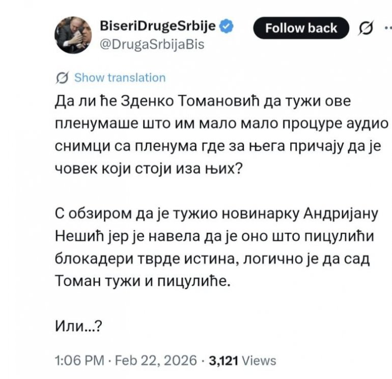 - Da li će Zdenko Tomanović da tuži ove plenumaše što im malo, malo procure audio snimci sa plenuma, gde za njega pričaju da je čovek koji stoji iza njih? S obzirom da je tužio novinarku Andrijanu Nešić jer je navela da je ono što je piculići blokaderi tvrde istina, logično je da sad Toman tuži i piculiće. Ili... - navodi se u objavi na mreži X.