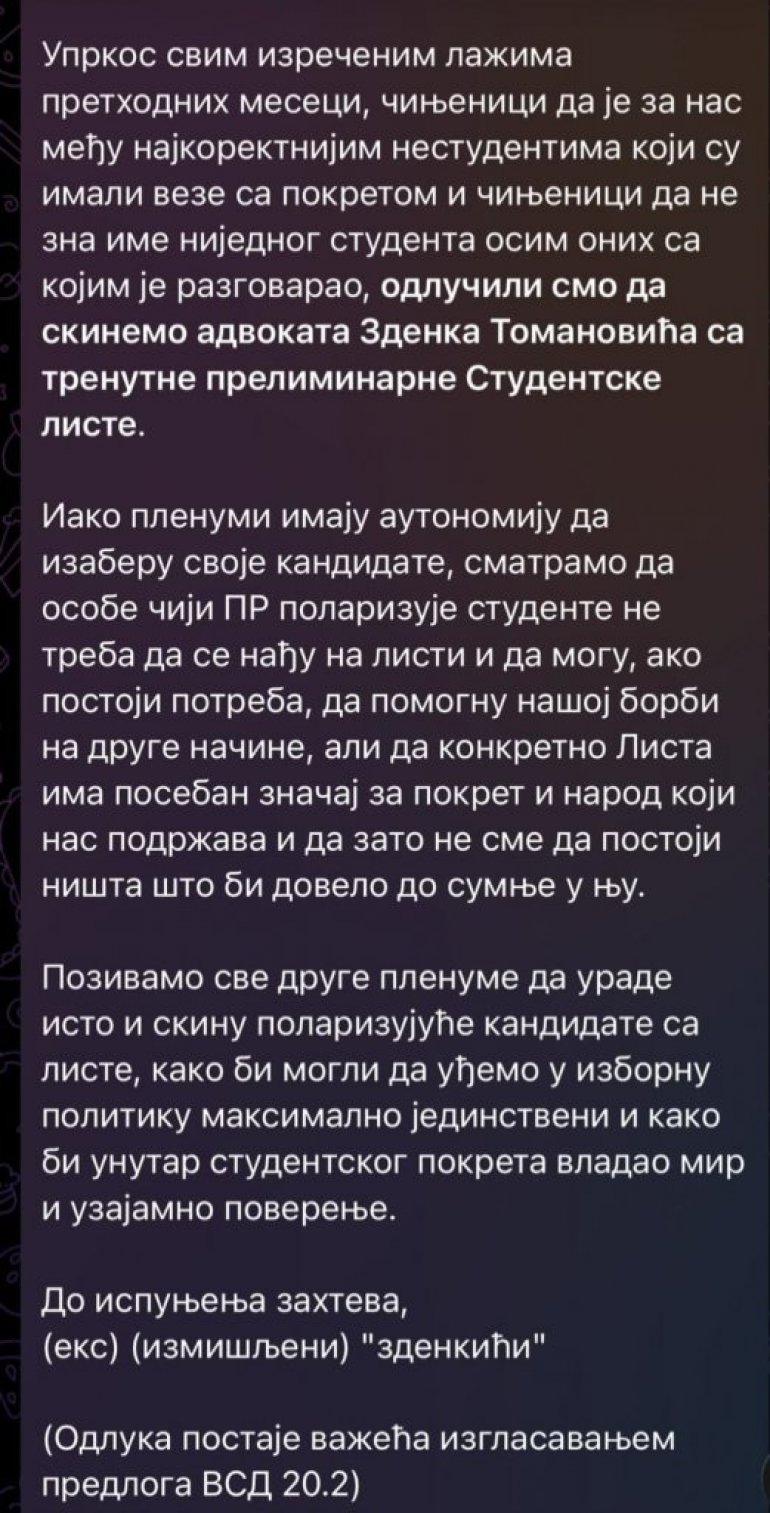 "Uprkos svim izrečenim lažima prethodnih meseci, činjenici da je za nas među najkorektnijim nestudentima koji su imali veze sa pokretom i činjenici da ne zna ime nijednog studenta osim onih sa kojim je razgovarao, odlučili smo da skinemo advokata Zdenka Tomanovića sa trenutne preliminarne Studentske liste.