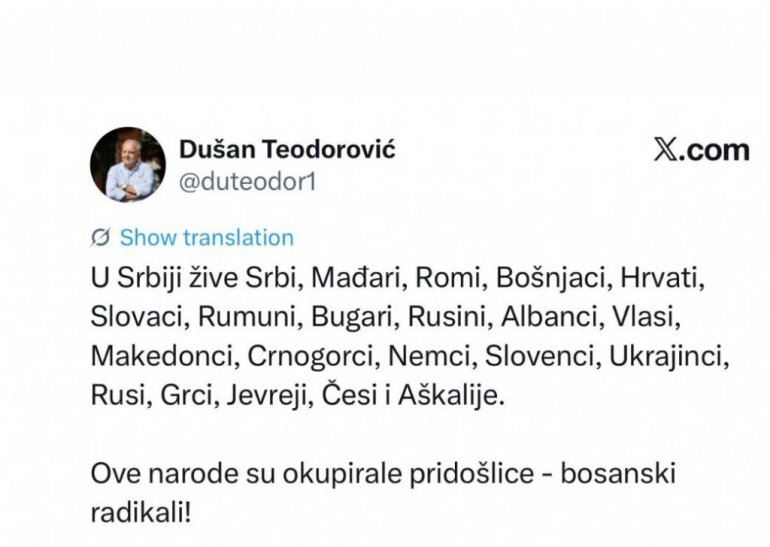 - U Srbiji žive Srbi, Mađari, Romi, Bošnjaci, Hrvati, Slovaci, Rumuni, Bugari, Rusini, Albanci, Vlasi, Makedonci, Crnogorci, Nemci, Slovenci, Ukrajinci, Rusi, Grci, Jevreji, Česi i Aškalije. Ove narode su okupirale pridošlice - bosanski radikali - napisao je Teodorović u objavi na mreži X.