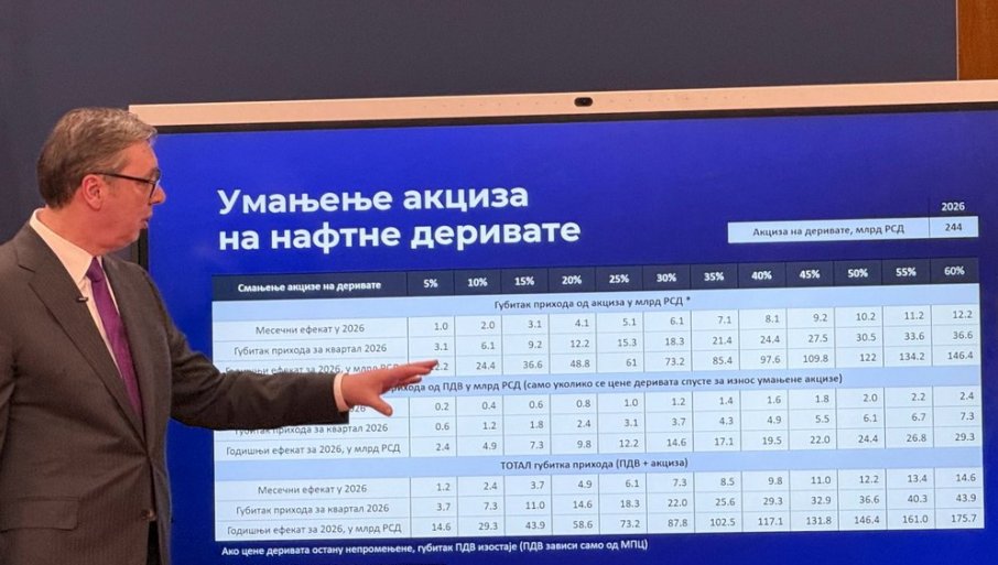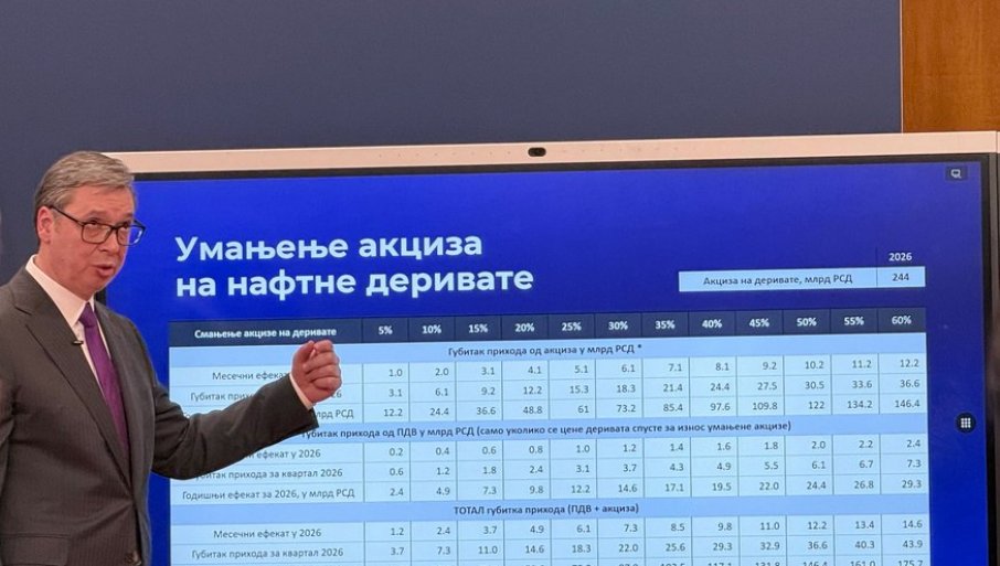 Vučić kaže da će prva mera u oblasti energetike već od danas biti dodatno smanjenje akciza za još 40 odsto, što je kumulativno smanjenje akciza od oko 61 odsto.