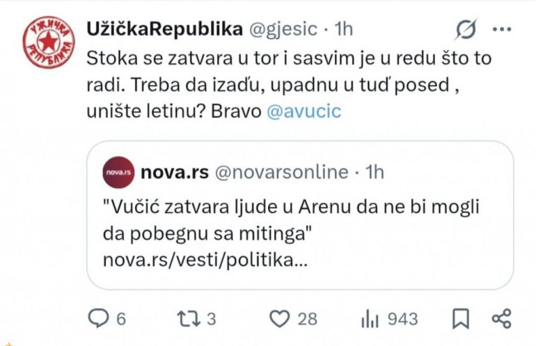 Na društvenoj mreži Iks, pojavila se objava gde se jasno vidi da je za blokadere svako ko podržava predsednika Aleksandra Vučića stoka.