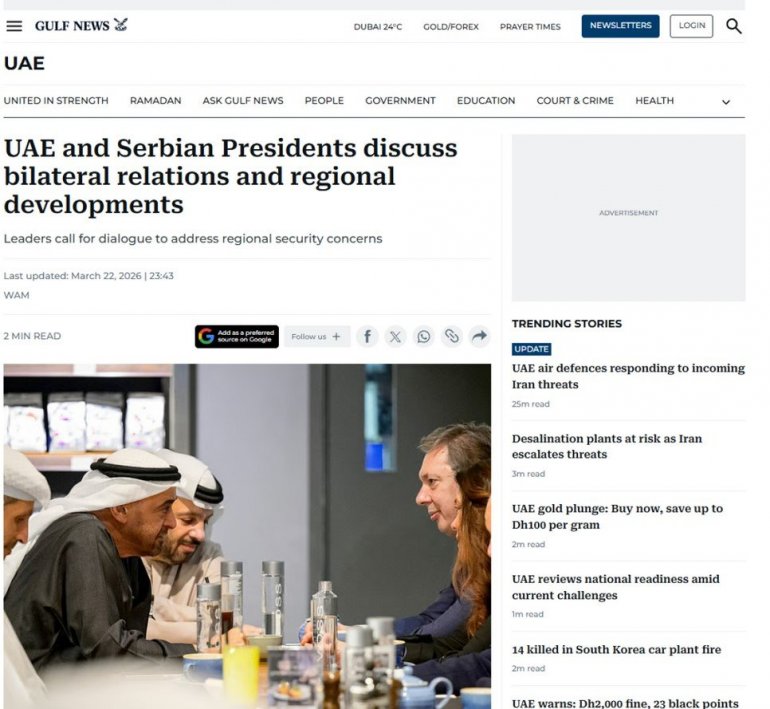"Galfnews", najveći medij na engleskom jeziku iz ovog dela sveta, objavio je opsežan izveštaj o razgovoru Mohameda bin Zajeda i predsednika Srbije, u kom se ističe da su sagovornici pozvali na hitan prekid ratnih dejstava i istakli značaj dijaloga u složenim geopolitičkim odnosima na Bliskom istoku.