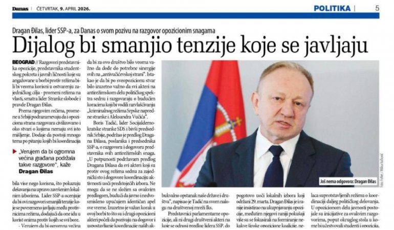 Naime, lider Stranke slobode i pravde Dragan Đilas, izjavio je za Danas da bi "dijalog smanjio tenzije koje se javljaju".