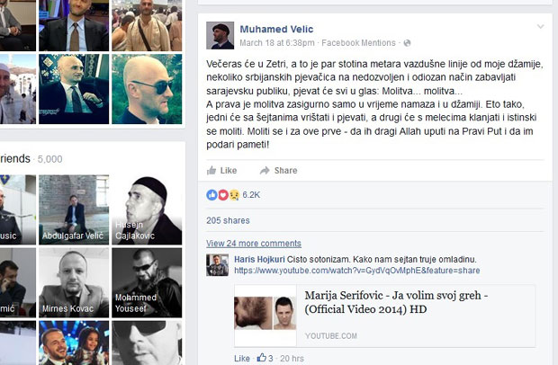 - Večeras će u "Zetri", a to je par stotina metara vazdušne linije od moje džamije, nekoliko srbijanskih pevačica na nedozvoljen i odiozan način zabavljati sarajevsku publiku. Pevaće svi u glas "Molitva, molitva"... A prava je molitva zasigurno samo u vreme namaza i u džamiji. Eto tako, jedni će sa šejtanima vrištati i pevati, a drugi će s melecima klanjati i istinski se moliti. Moliti se i za ove prve da ih dragi Alah uputi na pravi put i da im podari pameti - napisao je Velić, kojeg na "Fesbuku" prati više od 33.000 ljudi.