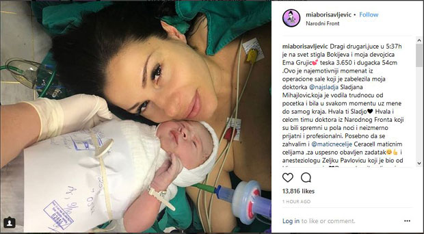 Dragi drugari, juče u 5:37 je na svet stigla Bokijeva i moja devojčica Ema Grujić, teška 3.650 i dugačka 54cm. Ovo je najemotivniji momenat iz operacione sale koji je zabeležila moja doktorka Slađana Mihajlović, koja je vodila trudnoću od početka i bila u svakom momentu uz mene do samog kraja. Hvala ti Slađo. Hvala i celom timu doktora iz Narodnog Fronta koji su bili spremni u pola noći i neizmerno prijatni i profesionalni. Posebno da se zahvalim i Ceracell matičnim ćelijama, za uspesno obavljen zadatak i anesteziologu Željku Pavloviću koji je bio od ključnog značaja. Drage devojke, divan je osećaj biti mama i vredi svakog bola! Dragi prijatelji, lepo se provedite večeras i popijte koju i za mene. Vole vas vaši Mia, Ema i Boki.