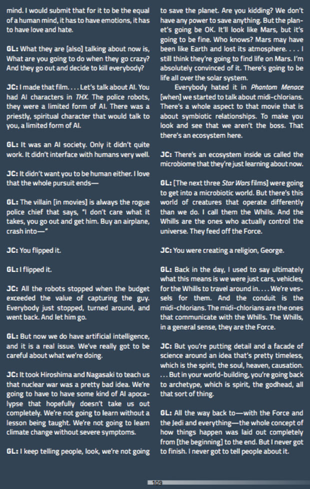 Što se Kameronovog dokumentarnog serijala tiče, knjižica sa transkriptima se može kupiti, a u njoj smo pronašli i dotični intervju sa Lukasom - pročitajte ključni isečak: