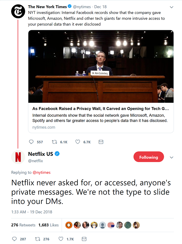 Sve u svemu, 150 kompanija je zahvaljujući ovom "curenju" saznalo sve o informacijama korisnika socijalne mreže iz 2010 godine i navodno do 2018 i nadalje. Netfliks je o ovom progovorio duhovito na svom Tviter nalogu, kao odgovor na članak The New York Times-a: "Netfliks nikad nije tražio, niti pristupio ličnim porukama korisnika. Mi nismo kompanija čije informacije cure kroz lične poruke".