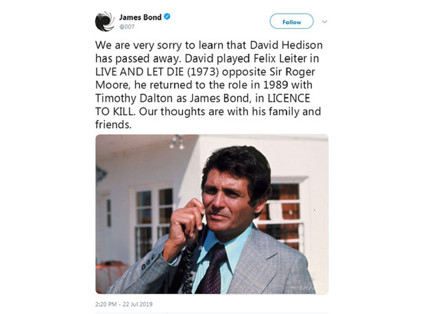 Na zvaničnom Tviter nalogu Džejms Bonda, pojavila se objava sa kojom su se oprostili od Dejvida uz njegovu staru fotografiju.
