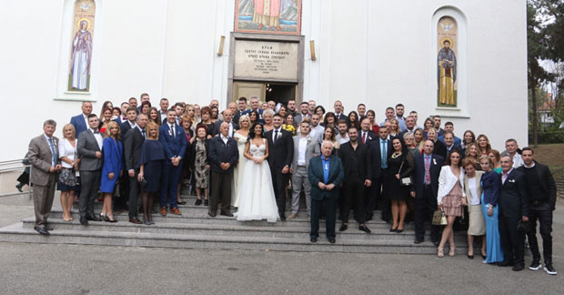 Katarina se odlučila zabelu venčanicuizrazito dubokog dekoltea, dok je Ljuba u crnom odelu i beloj košulji.